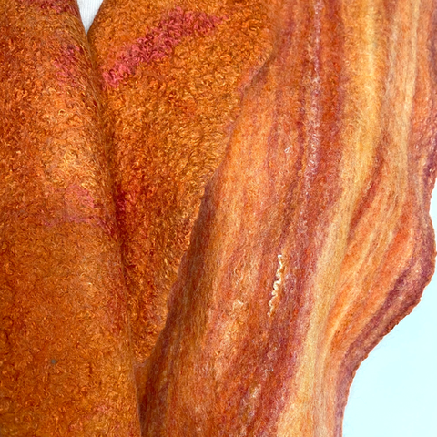 My love of textiles began at an early age, inspired by my mum. I have dabbled in weaving, dyeing and machine embroidery before concentrating primarily on wet feltmaking. I have been making felt since around 2013 and have taken a wide variety of in person and on line workshops and courses, both with international and local feltmakers, to bring the quality of my felt to a high standard. I love the magic of creating useable and desirable items from a fluffy pile of sheep fleece! Sometimes I dye or ecoprint the end result. I also enjoy adding machine embroidery to my felt. I make primarily wearable items such as scarves and bags but also like to experiment with mixed media art work and vessels. Much of my inspiration comes from the natural world around us.